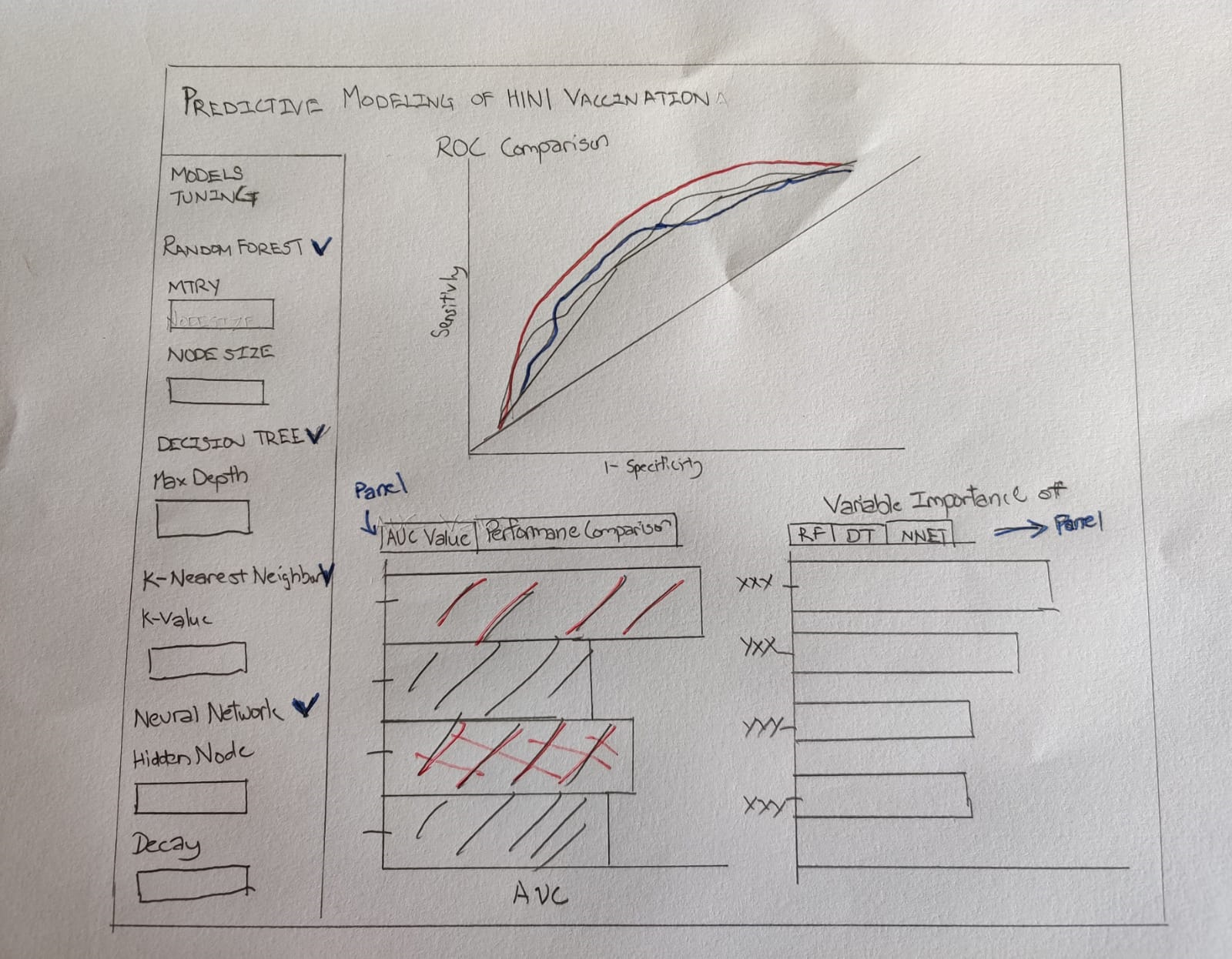 The predictive modeling component of the Shiny application allows the user to customize and use different modeling techniques to build a predictive model to predict whether an individual would take the H1N1 vaccine.