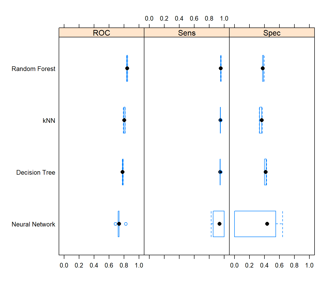 A box-whiskers plot is used to visualized the re-sampling distributions of the models.The best performing model on resamples based on mean ROC score was Random Forest model.Neural network model has the highest sensitivity.